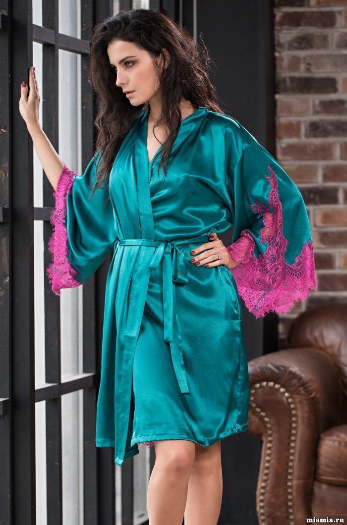 A short dressing gown is made of plain vibrant mixed silk fabric with fantastic wide lace.