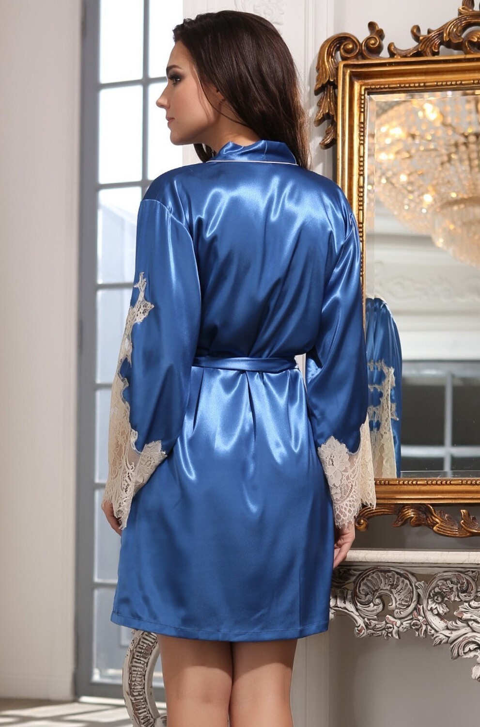 A short dressing gown is made of plain vibrant mixed silk fabric with fantastic wide lace.