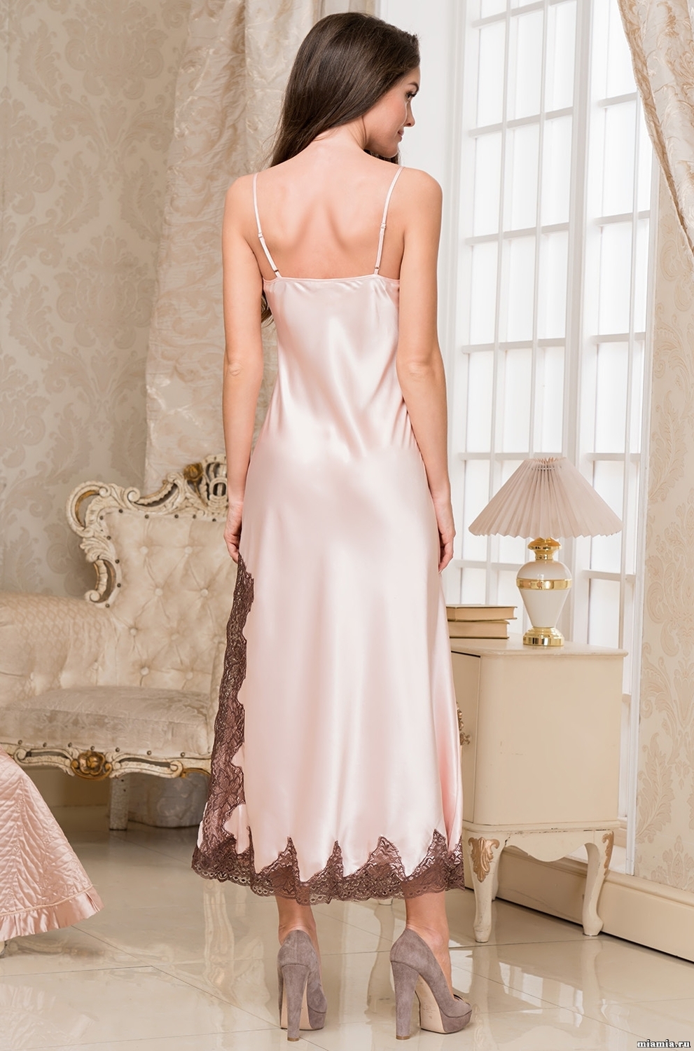 A long nightdress with thin shoulder straps is made from blended silk. The bodice and the hemline are decorated with exquisite lace, and the edge of the fabric cut in the shape of scalloped lace gives the model an amazing airy lightness.
