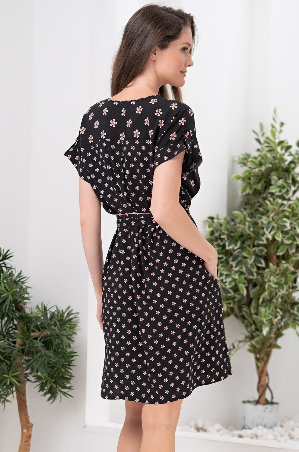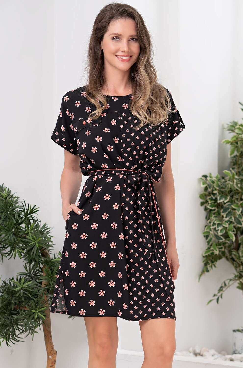 Knee-length Mia-Amore tunic with one-piece short sleeves is crafted from printed viscose fabric. The symmetrical details of the tunic on the front are made of a print of different scales. If desired, the belt creates a fitted silhouette.