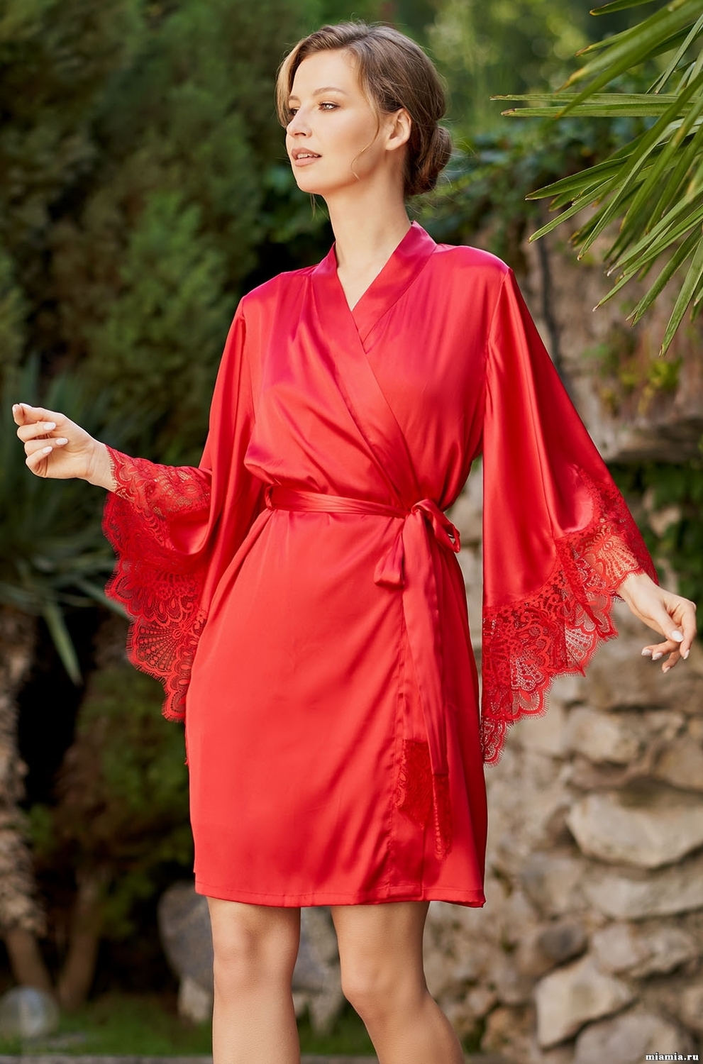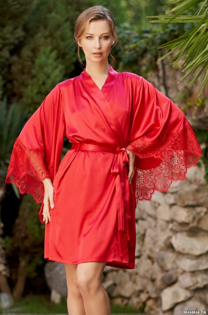 A short dressing gown with wide flared sleeves like a bird's wing. The bottom of the sleeves is decorated with a lace insert, and the edge of the primary material is cut in the shape of scalloped lace, which adds lightness and elegance to this model.