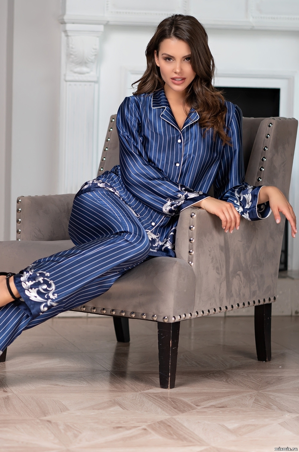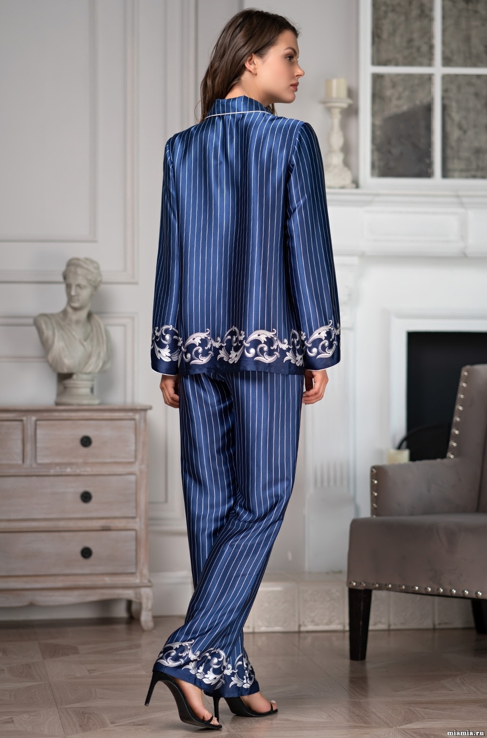 The Barocco trouser set is made of deep blue soft polyester, decorated with a Baroque style print. The set consists of a blazer with buttons and trousers. The collar, and the cuffs of the sleeves are decorated with a thin white edging. The trousers have pockets.