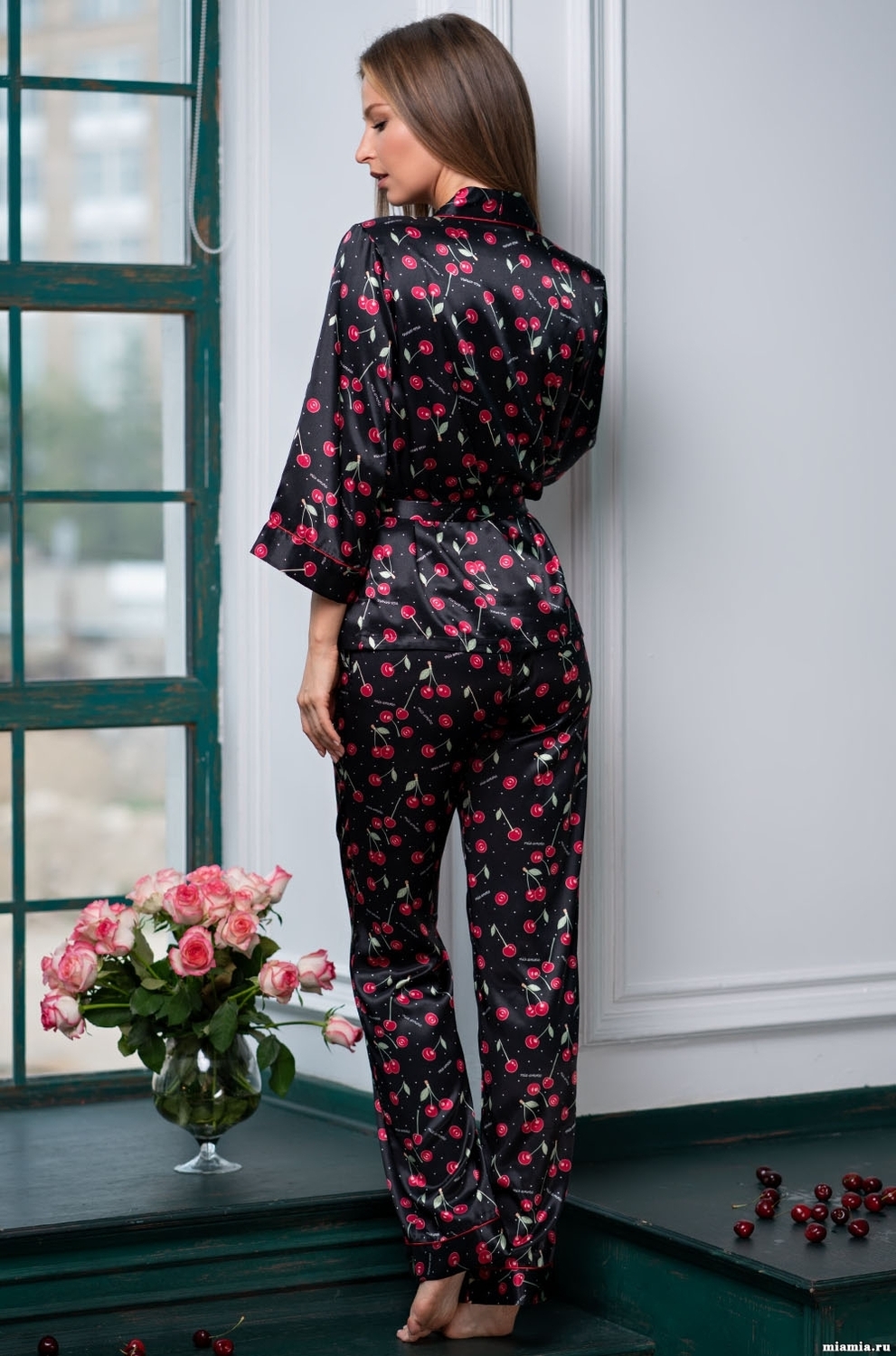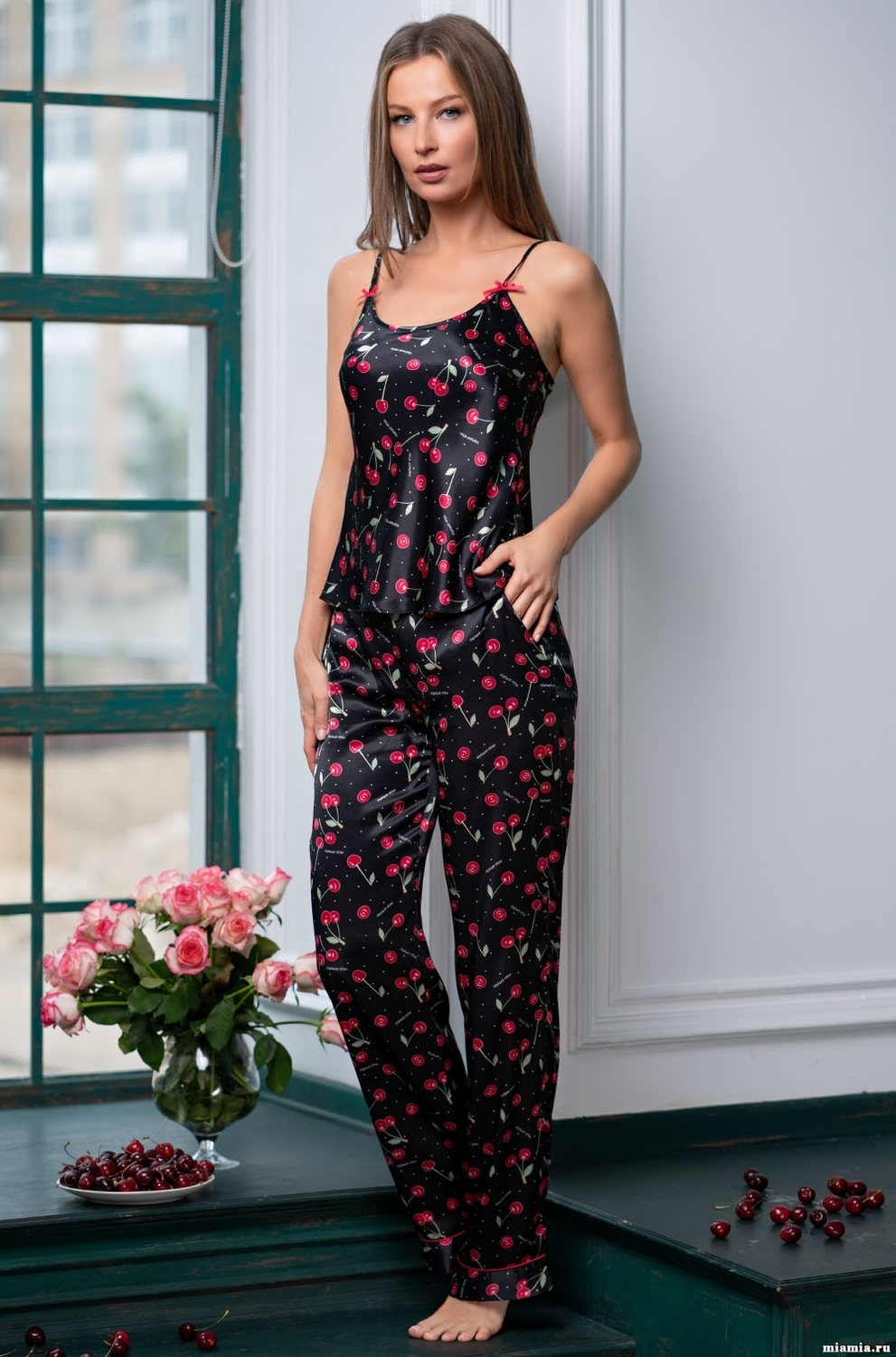 Juicy cherries! An elegant three-piece set is made of supersoft polyester. Belted shirt with ¾ sleeves. The cuffs of the sleeves, neckline of the cami are decorated with trim. There are pockets in the side seams of the trousers.
