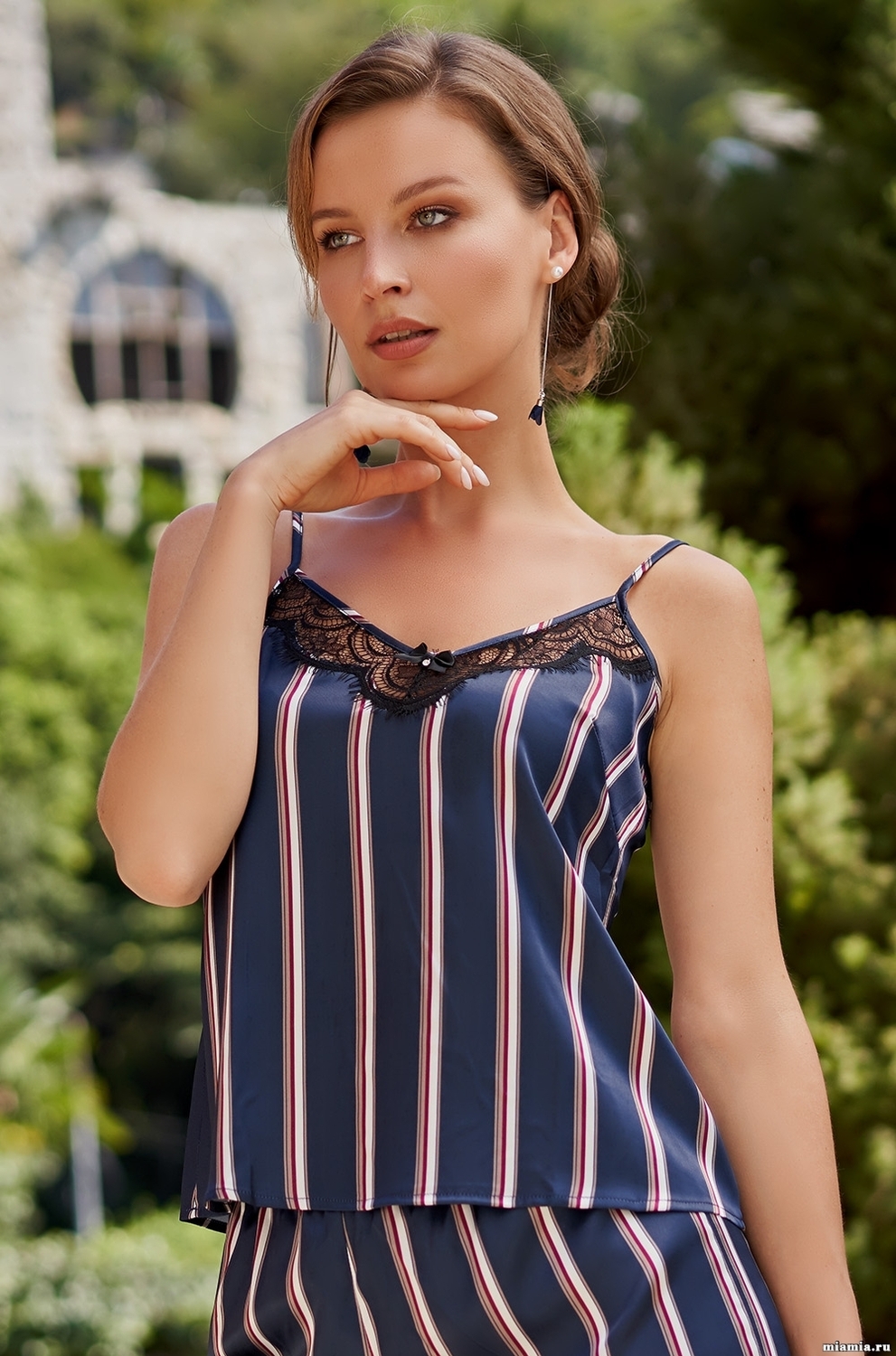 Top Normandia is made of soft polyester with thin straps. The top of the neckline and the hemline of the product are elegantly decorated with lace. The top is decorated with a black bow with a crystal pendant.