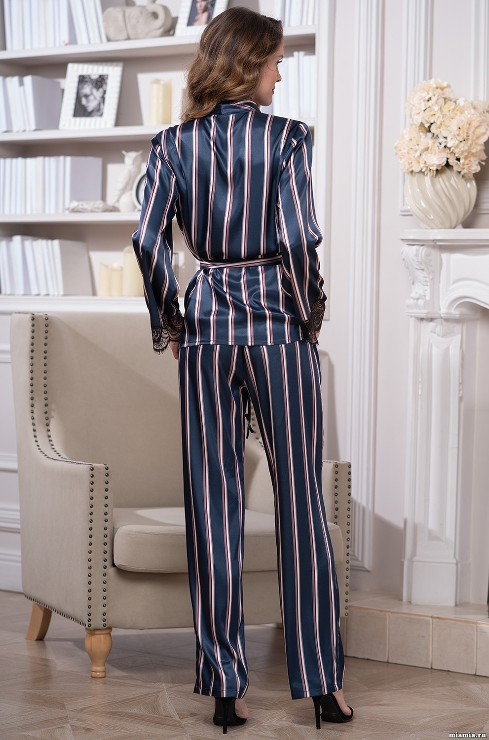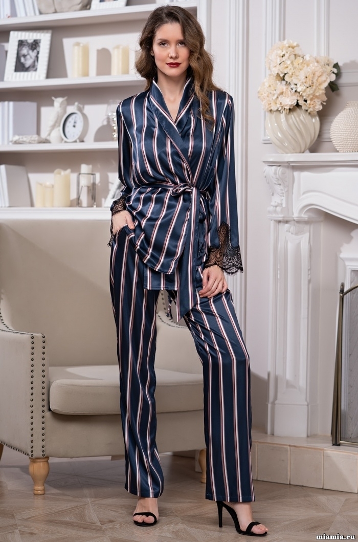 Elegant three-piece set NORMANDIA from soft polyester consists of a blazer, night top and trousers. The blazer is of a free silhouette with long sleeves, has a turn-down collar and a belt. The cuffs of the sleeves are decorated with lace. The night top has thin straps, the bodice is decorated with lace and an elegant black bow with a pendant. Trousers are of classic cut, have pockets in the side seams.