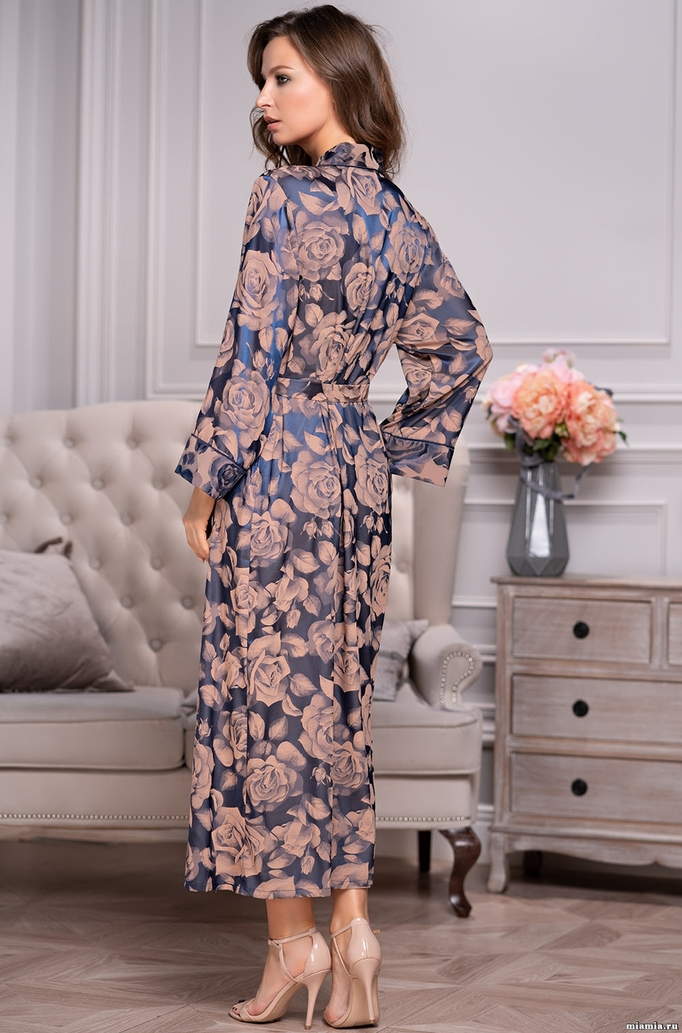 Long dressing gown is made of supersoft polyester. This piece of art will make you glam. The cuffs of the sleeves and the hem line are decorated with a single-colour piping. A wraparound dressing gown has a belt and the pockets in the side seams.