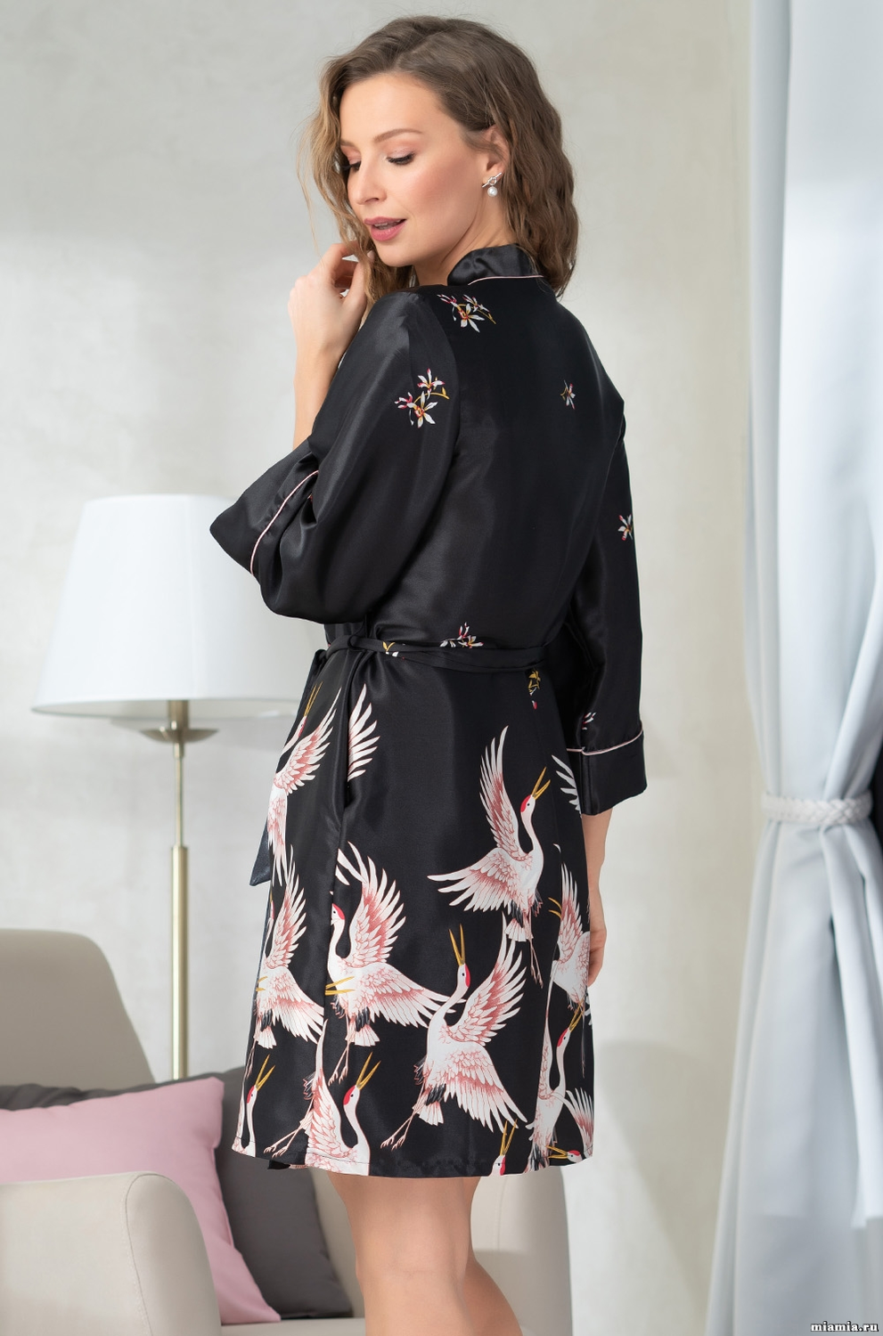 STEFANIA short robe is made of printed lightweight polyester. The line of the side and the cuffs of the sleeves are decorated with a plain contrasting piping. Pockets are in the side seams.