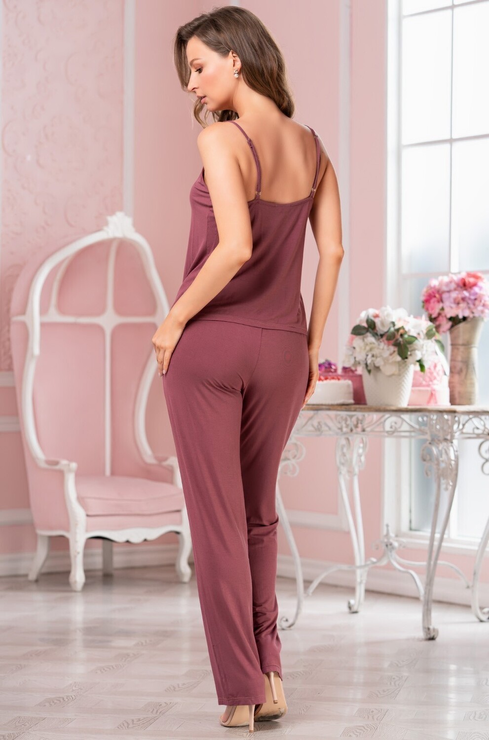 The three-part pyjama set is made of plain viscose.